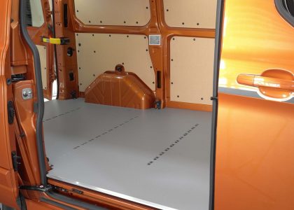 Der Laderaum besticht durch Doppelflügelhecktüren und eine Schiebetür rechts. Eine Trennwand sichert den Laderaum ab. Besonders praktisch der Ladeboden von Sortimo. \\ \\